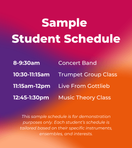 While each student is provided a customized schedule, the general timeframes for students based on their major ensemble are listed below. These are general guidelines: individual schedules will vary, and class times may shift depending on the make-up and level of the student body.