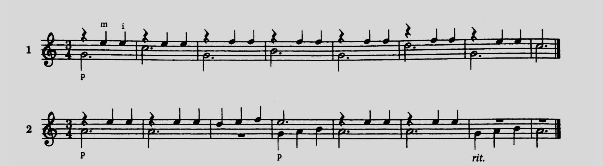 - Etudes for bass clarinet only: 21 Foundation Studies for Alto and Bass Clarinet, ed. William E. Rhoads: Etude #10 – Allegretto quasi andantino, Meas. 1- Fine (p. 17)